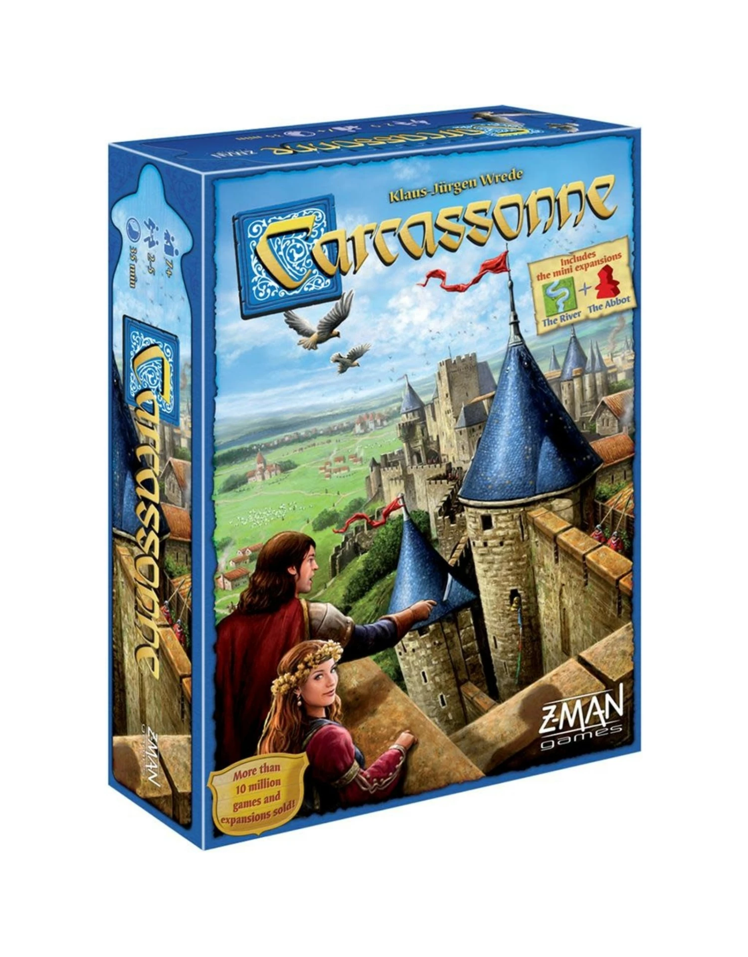 Inspired by the medieval fortress in southern France of the same name, Carcassonne is a tile-laying game in which players fill in the countryside around the fortified city. Players choose from tiles that depict cities, roads, monasteries, and fields; each new tile placed creates an ever-expanding board on which players can then add their followers. Players score points by having followers on features as they’re completed. The player who makes the most strategic placements of tiles and followers will score the most points and win the game.With its simple yet rich game mechanics and eighty-four tiles that can be configured into numerous combinations, Carcassonne appeals to beginners and veteran gamers alike. This edition is entirely redesigned and modernized, and includes two expansions: The River and The Abbot.