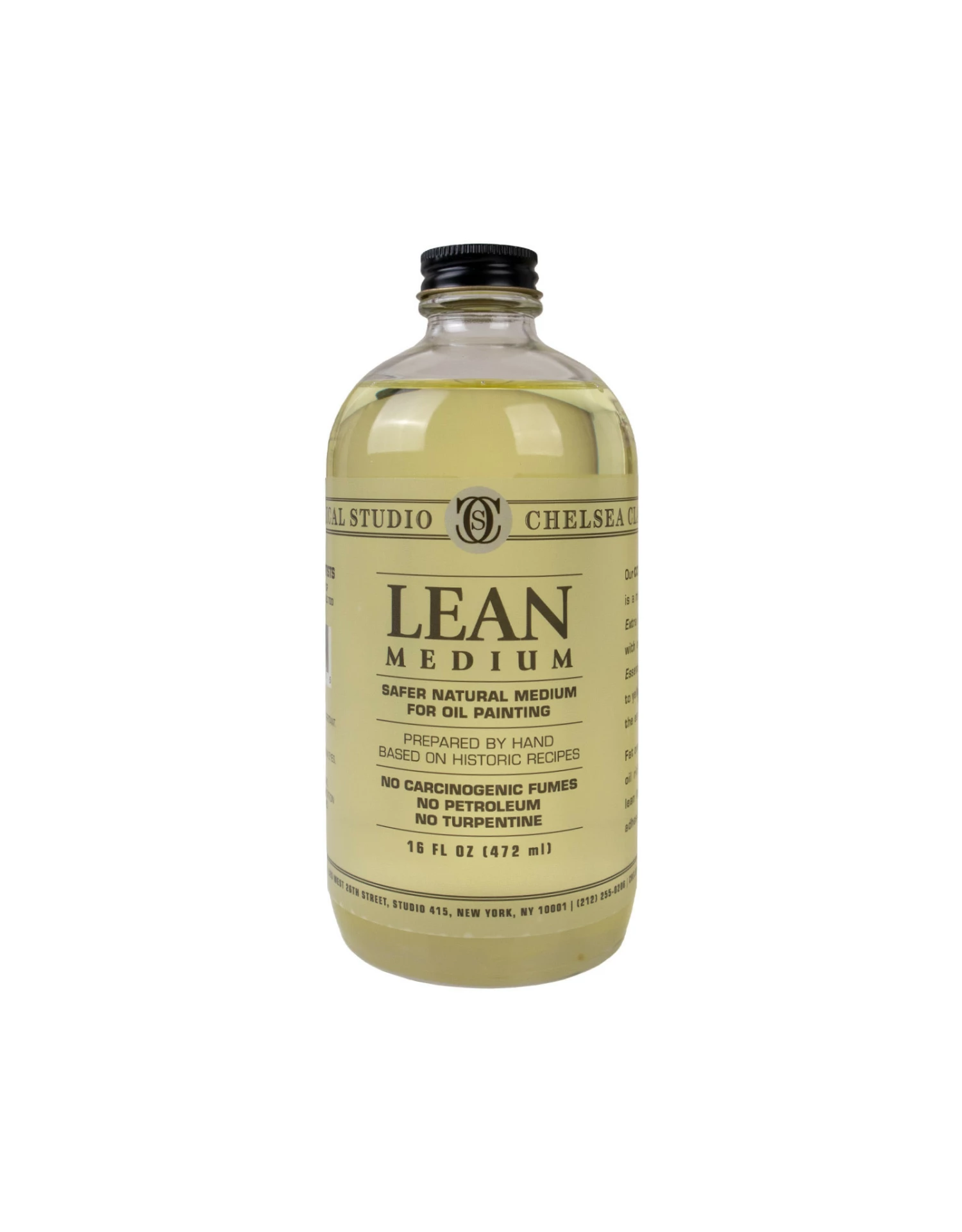 Chelsea Lean Medium is cold-pressed, purified and de-yellowed through traditional, natural processes to give you the purest product. This archival-quality medium thins oil paints and decreases drying time. Lavender spike oil essence is added not only to give this medium a pleasant aroma, but it’s historically documented as a solvent used since the Renaissance.