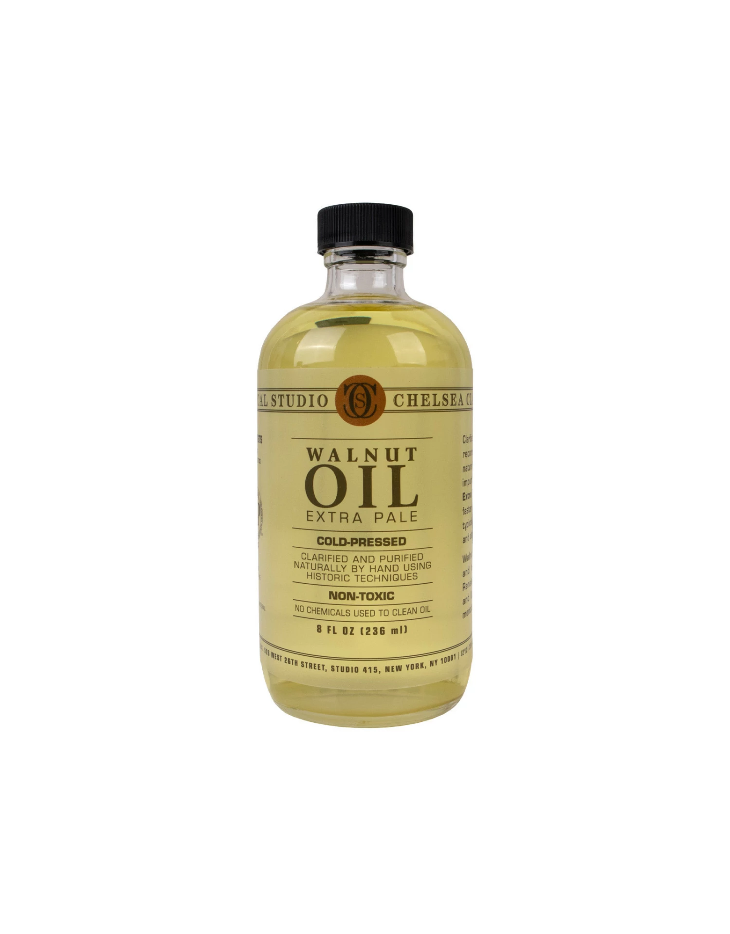 Chelsea Walnut Oil is hand-cleaned and purified using traditional methods. This oil dries slower than linseed oil and improves the richness and brightness of white and light oil colors. Meticulously handcrafted using historical recipes and techniques, this fine art oil medium has no harsh chemicals and is safer than other oil painting mediums.