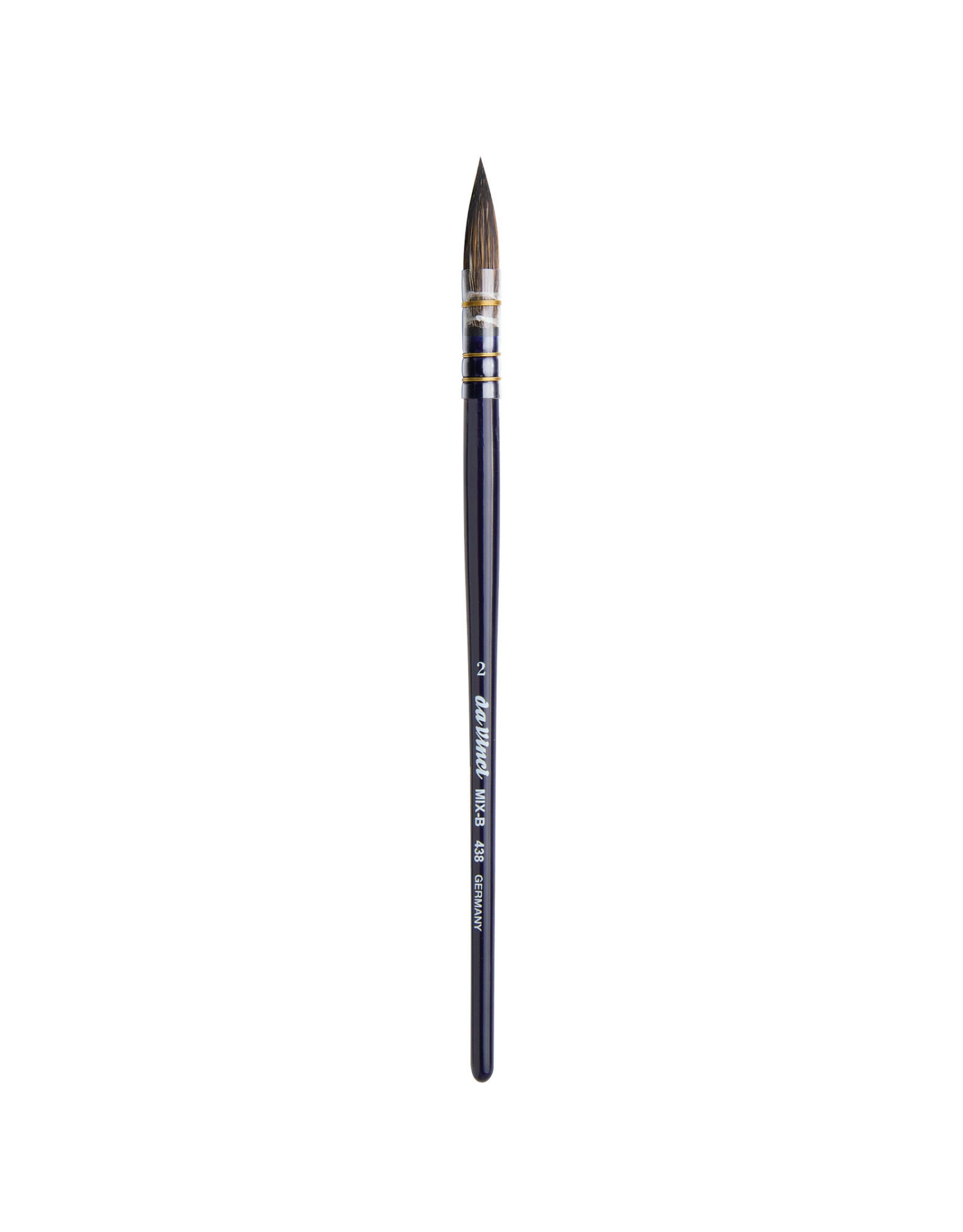 Da Vinci’s Cosmotop Sable Mix is a combination of Kolinsky Red Sable, Russian Blue Squirrel, and Russian Fitch (Black Sable) hair, along with small amounts of synthetic hair. This brush features the pointing and edging of Sable, the water-holding capacity and wash strokes of Squirrel, and the stiffness and durability of Fitch. The Blue lacquered wooden handle is paired with a wire-bound quill ferrule.