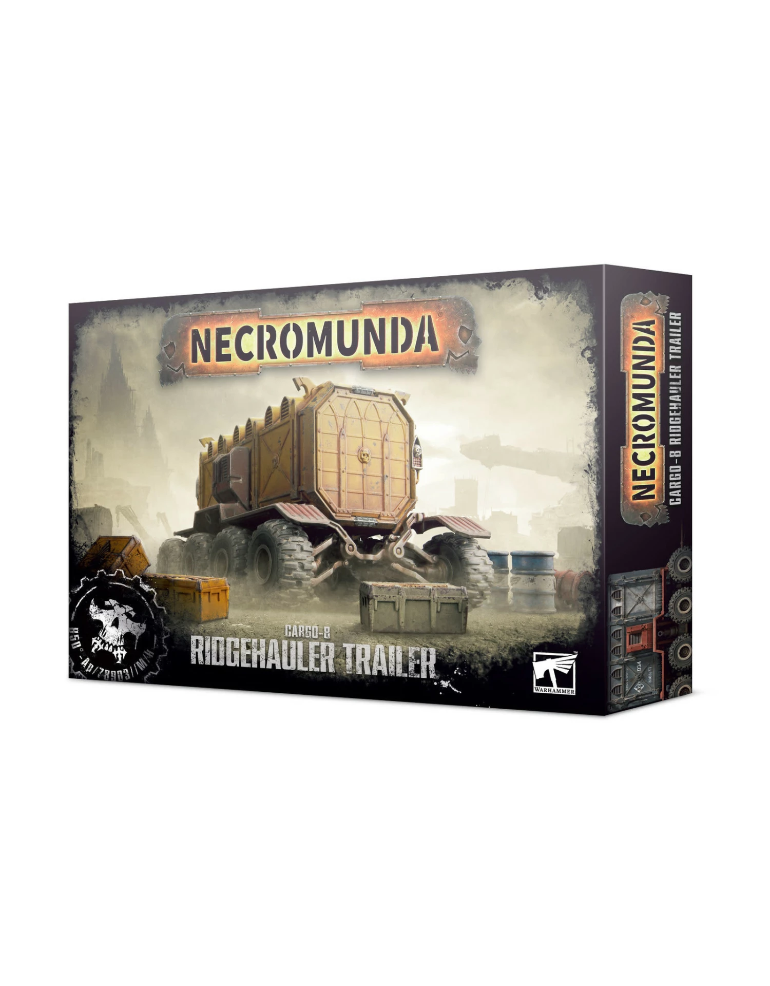 This multipart plastic kit allows you to build a Ridgehauler Trailer with a Munitorum Armoured Container, for use with a Cargo-8 Ridgehauler. You can construct this trailer with six or eight wheels, and the Ridgehauler Trailer’s modular assembly options allow you to field it with a flatbed cargo bay capable of carrying gang fighters and freight goods, or with a Munitorum Armoured Container, which can be fitted with up to two mounted storm bolters. The Ridgehauler Trailer can also be fielded with an adjustable rear coupling, allowing you to hook additional trailers onto your land train – each Cargo-8 Ridgehauler can tow up to four trailers. This box contains:
