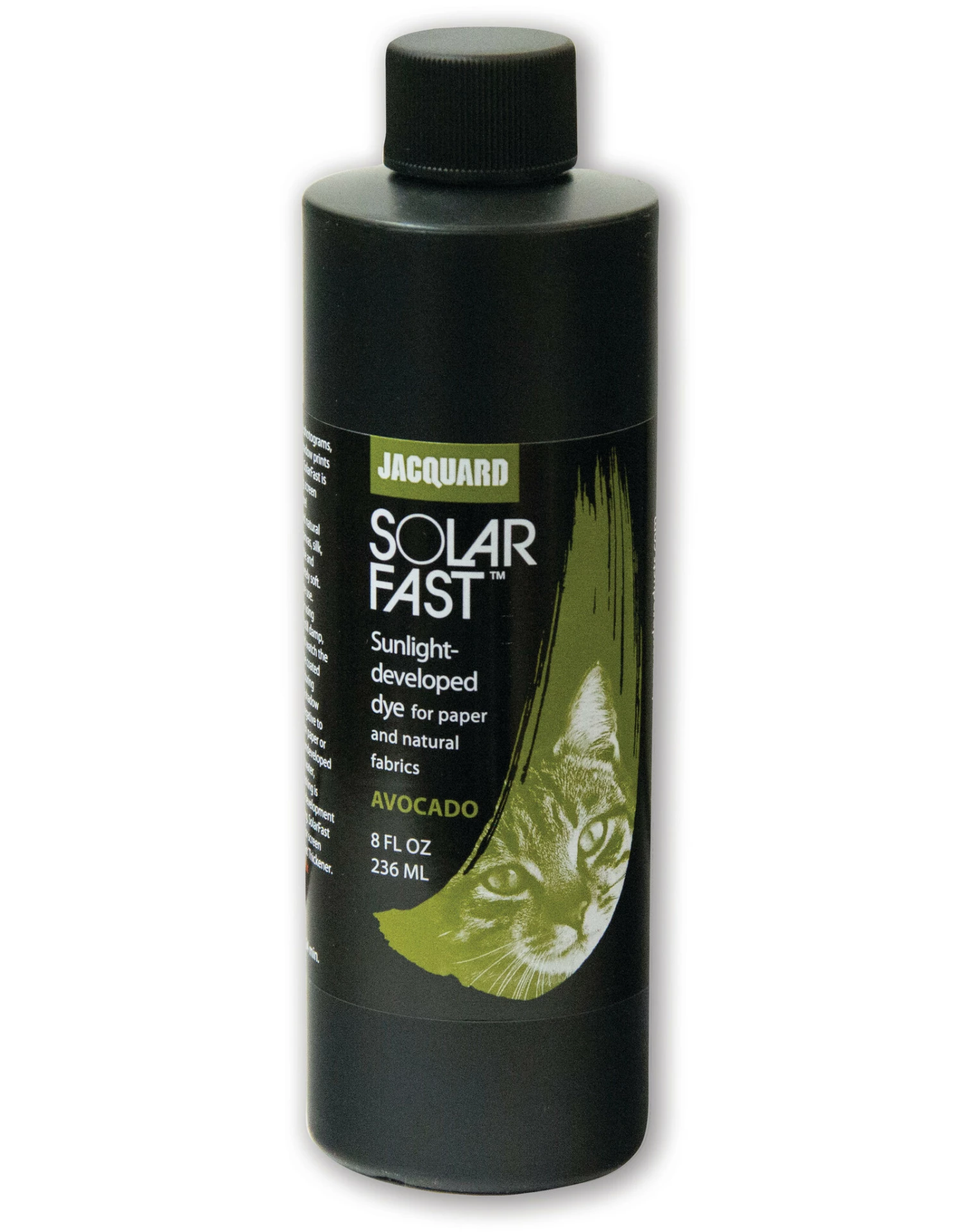 Jacquard SolarFast is a pigmented liquid dye that only develops color and becomes permanent from exposure to sunlight (UV). To use, paint your chosen surface with SolarFast and place something on the surface if desired, then expose it to sunlight. Anything that blocks the light will create a printed impression in a matter of minutes, whether a solid object or a photographic negative. The dye leaves fabric completely soft to the touch and it will not affect the texture of paper.