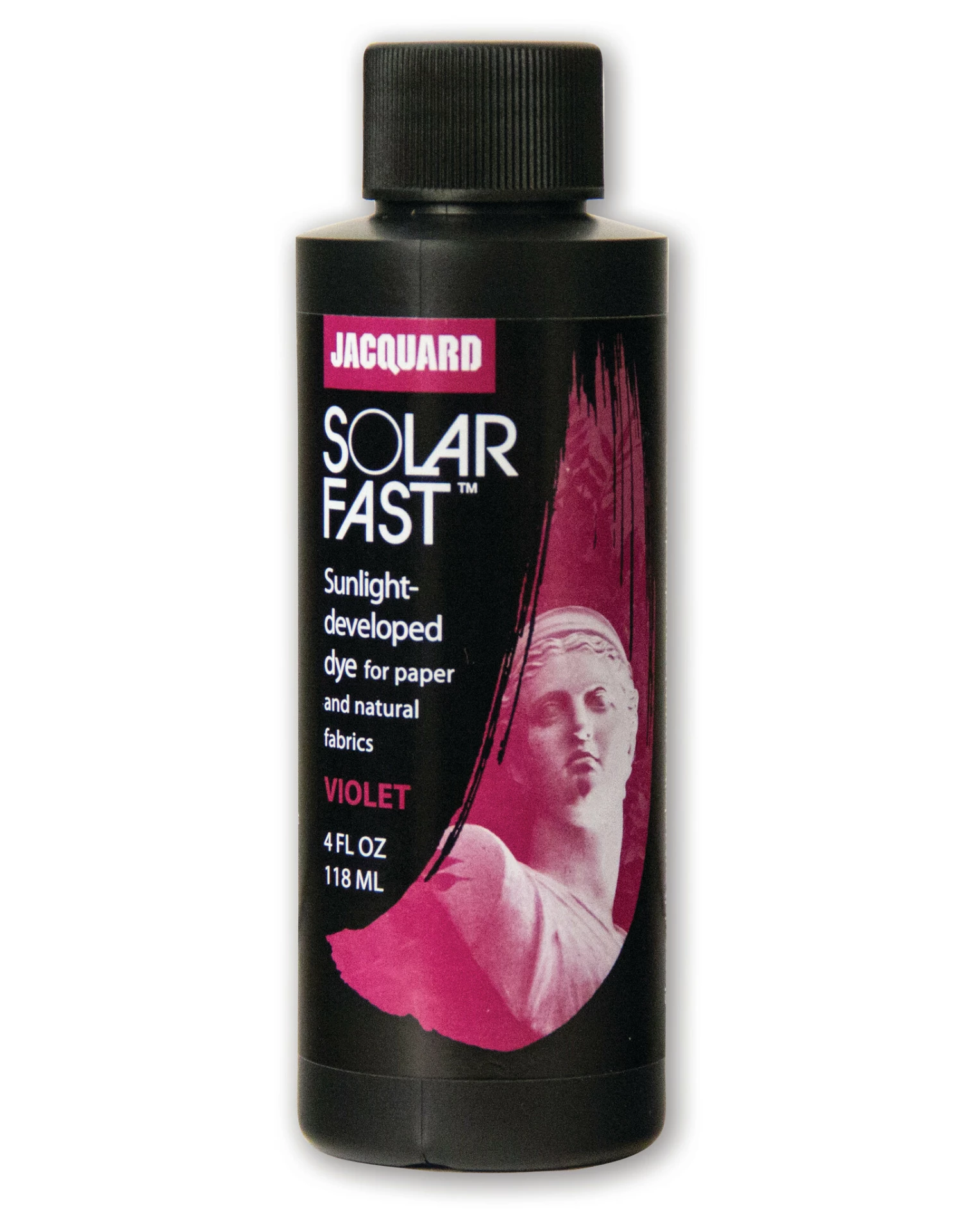 Jacquard SolarFast is a pigmented liquid dye that only develops color and becomes permanent from exposure to sunlight (UV). To use, paint your chosen surface with SolarFast and place something on the surface if desired, then expose it to sunlight. Anything that blocks the light will create a printed impression in a matter of minutes, whether a solid object or a photographic negative. The dye leaves fabric completely soft to the touch and it will not affect the texture of paper.