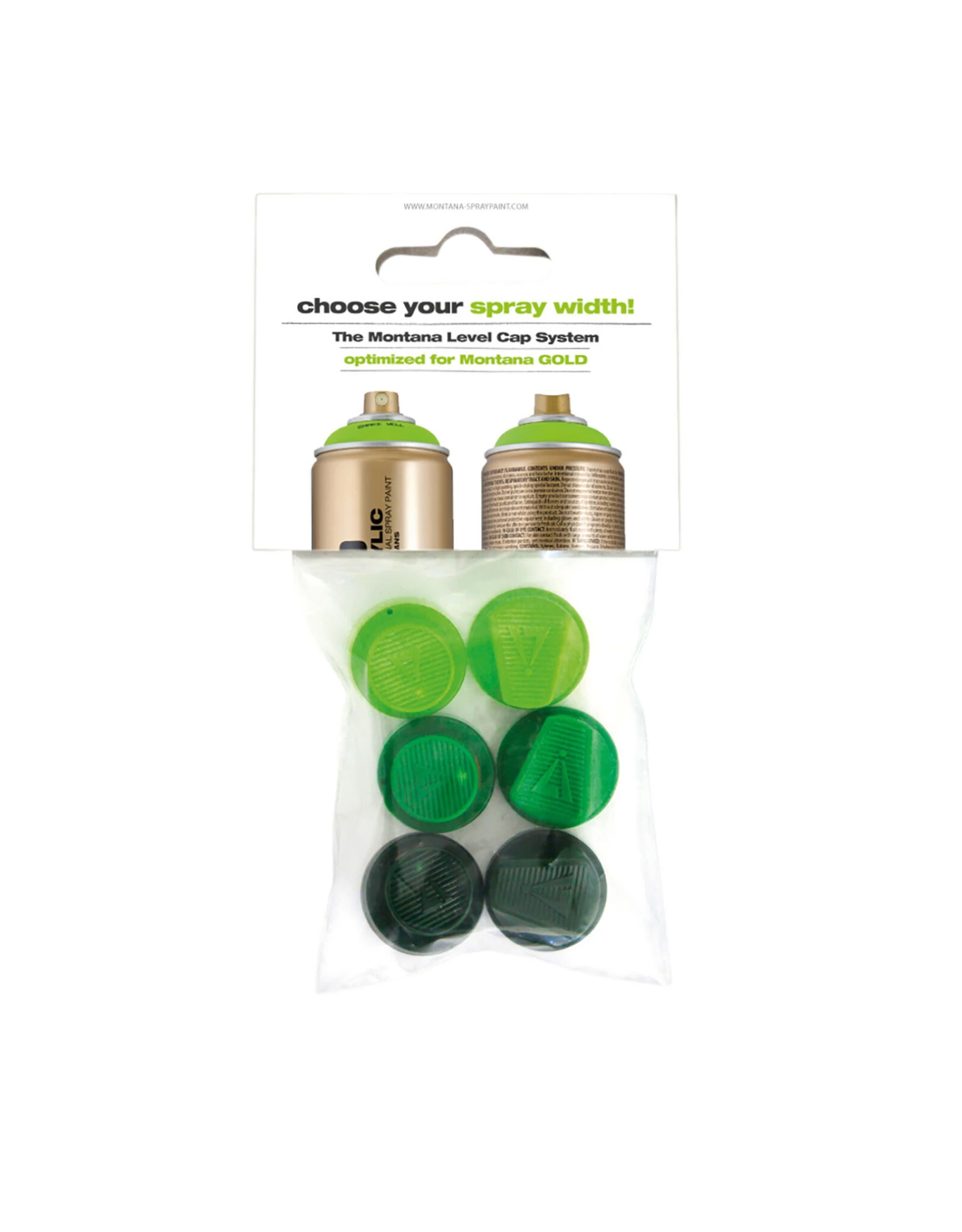 These leveled spray caps feature an easy-to-understand identification system based on both shape and color, and result in a varying spray output ranging from very skinny to super fat lines. The three skinny caps have an indented cap head and a black dot nozzle. The three fat caps have a rounded head, and pink or orange dot nozzle. Within both groups of skinny and fat caps, they range from narrow to wide spray widths based on the cap color – the green darkening as the spray width increases.