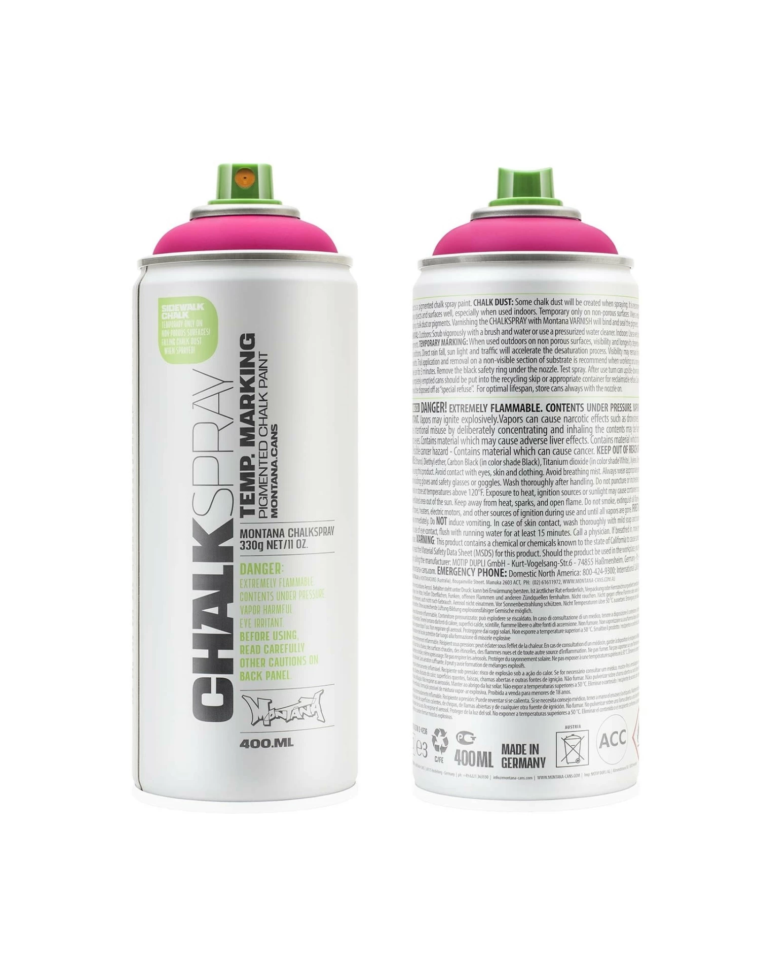 Montana CHALKSPRAY is a high-quality chalk-based pigment spray ideal for outdoor marking and painting (temporary only on non-porous surfaces). This paint is suited for use on a variety of surfaces such as sidewalks, walls, cardboard, canvas and glass, making it the ideal paint for event signage, advertisements, marketing campaigns and outdoor activities. Some chalk dust will be created when spraying. Wear a respirator mask to avoid inhaling chalk dust or pigments. For Removal Outdoors: Scrub vigorously with a brush and water or use a pressurized water cleaner.