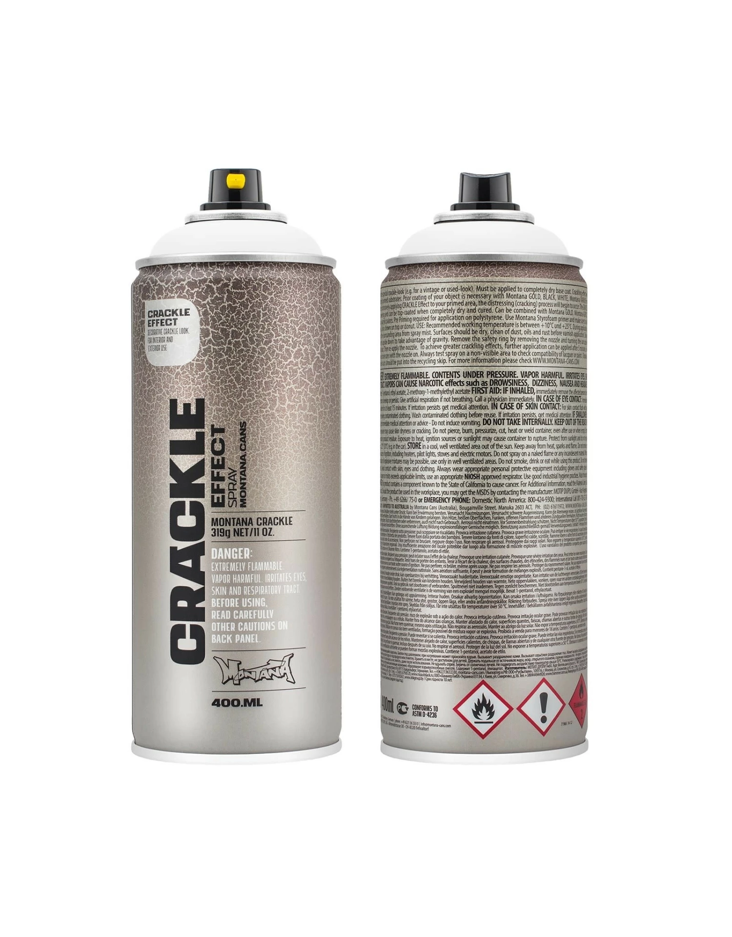 Montana CRACKLE is a high-pressure matte spray paint that is intended to provide a crackle effect. To use, let the base coat of paint dry at least 45 minutes but no more than 24 hours before applying the Crackle effect spray. After extensively and evenly applying the spray to your primed area, the cracking effect process will occur. Surfaces should be clean and free of any dust, oils and rust before use. Shake well before use. To achieve greater crackling effects, further application can be applied after 5 minutes.