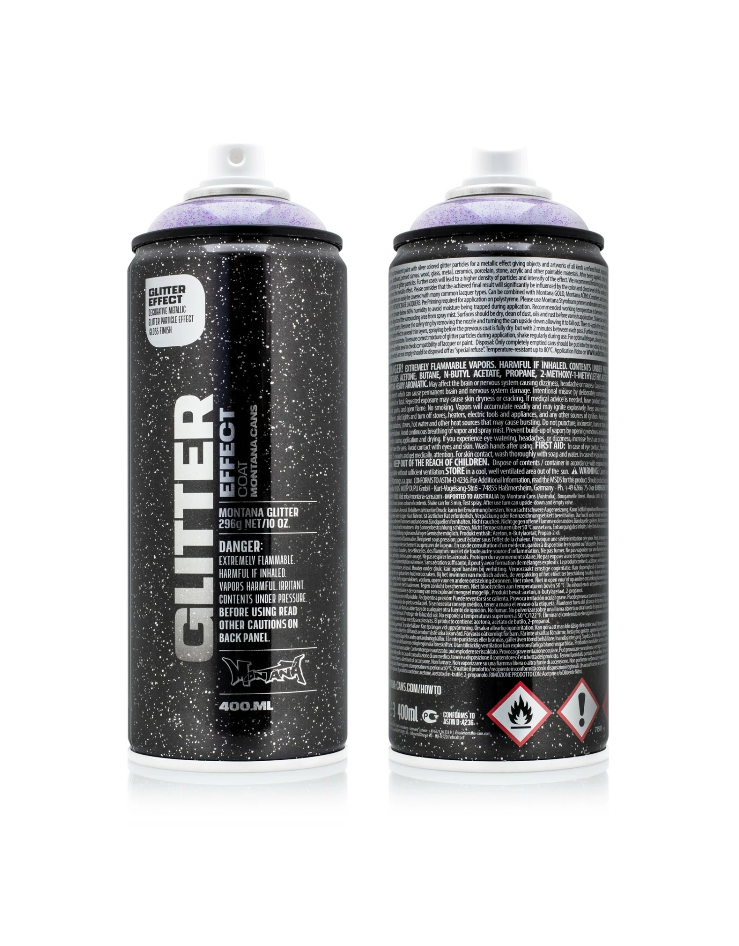 Montana GLITTER is a medium pressure, Nitro-Combi based paint intended to provide a high-quality, glossy, metallic glitter effect. This glitter spray paint is suited for use in a variety of projects on a variety of surfaces, such as paper, cardboard, primed canvas, wood, glass, metal, ceramics, porcelain, stone, acrylic and other paintable materials. Once dry, seal your project using Montana varnish for extra durability and an enhanced metallic effect. Final result will be significantly influenced by the color and gloss level of the undercoat. Shake well before use.