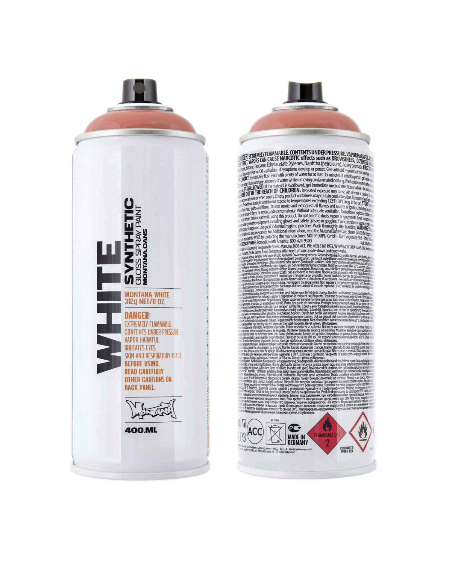 Montana WHITE spray paints provide speed and functionality to your spray paint work. Featuring a high-pressure valve system, you’ll have coverage, color and consistency you need in a shorter period. Montana WHITE spray paint is made from a synthetic paint base, formulated to achieve a fast drying time with a gloss finish, and weatherproof for year-round use.Â